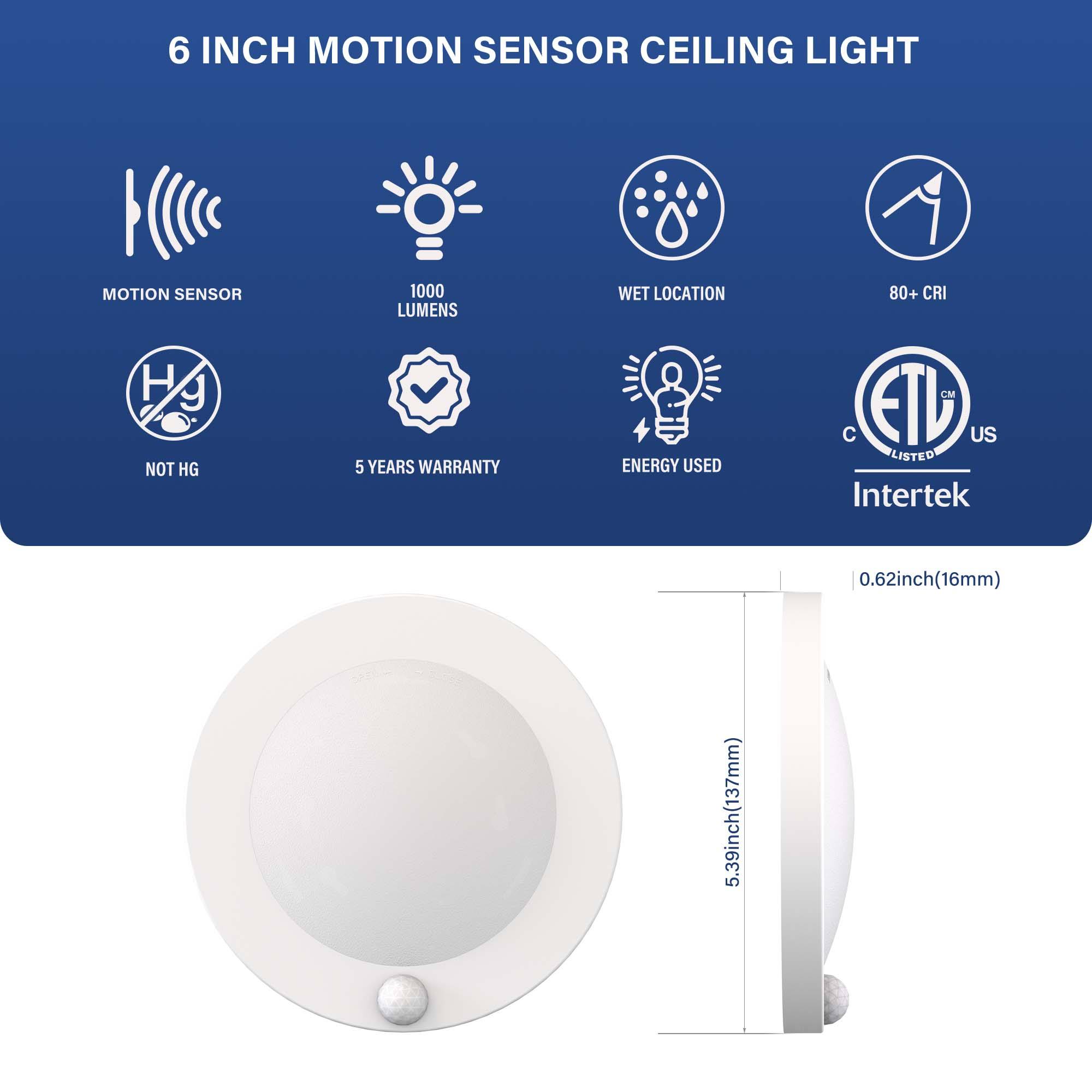 LED suface mount 4″ and 6 closet light with PIR motion sensor turns ON automatically when motion is detected not only in the dark. but also in the daylight and OFF after 30 seconds when no motion is detected. Ideal forclosets, workrooms, basements, storage areas, utility rooms and attics etc. ETL certified and suitable for indoor and outdoor wet locations.